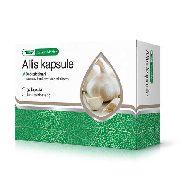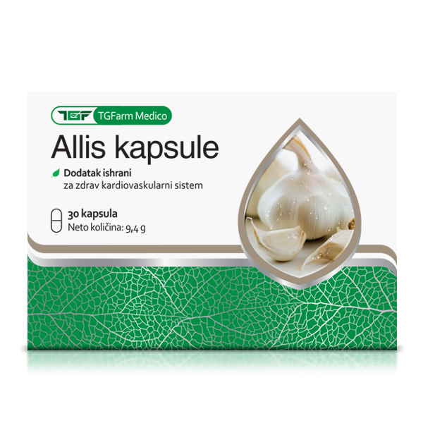 ALLIS + GLOG je potpuno prirodni preparat koji reguliše krvni pritisak, normalizuje rad srca, jača srčani mišić, poboljšava protok krvi i pomaže kod pojave zakrčenja krvnih sudova. Dejstvo ovog preparata zasnovano je na sinegriji belog luka i gloga, u narodu poznatih lekovitih preparata, koji se još koriste i za odstranjivanje otrovnih materija iz želuca, creva i krvi. Ovaj kompleks sastojaka povoljno deluje i na smirenje, protiv nesanice, premorenosti, glavobolje, neraspoloženja. Preporučuje se kao dodatak ishrani.