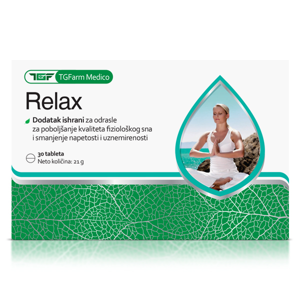 RELAX je potpuno prirodni preparat za smirenje na bazi valerijane, matičnjaka i hmelja, koji se preporučuje kod uznemirenosti, napetosti, razdražljivosti, zabrinutosti i poremećaja sna usled pojačane nervoze. Doprinosi potpunoj psihičkoj relaksaciji, deluje umirujuće, smanjuje nervnu napetost, olakšava uspavljivanje, poboljšava kvalitet sna i otklanja propratne funkcionalne poremećaje u varenju. Ne stvara zavisnost nakon duže upotrebe i potpuno je bezbedan. Preporučuje se kao dodatak ishrani.
