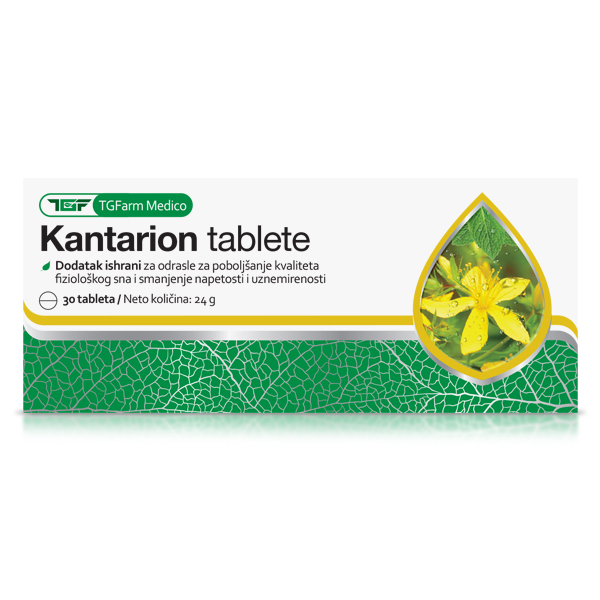 KANTARION tablete su dijetetski suplement na bazi kantariona i mente, čije aktivne supstance pomažu kod smetnji pri spavanju, napetosti, nervoze, kod problema varenja usled stresa, kao i kod čestih promena raspoloženja u klimakterijumu. Sinergističko delovanje ovih supstanci na organizam omogućava postizanje stanja psihičke i fizičke ravnoteže. Ovaj proizvod se preporučuje kod blagih i depresivnih poremećaja, kao i kod nervne iscrpljenosti nastale kao posledica duže izloženosti stresu. Kantarion tablete su pogodne za povremenu ili svakodnevnu upotrebu, jer ne stvaraju zavisnost ili naviku.